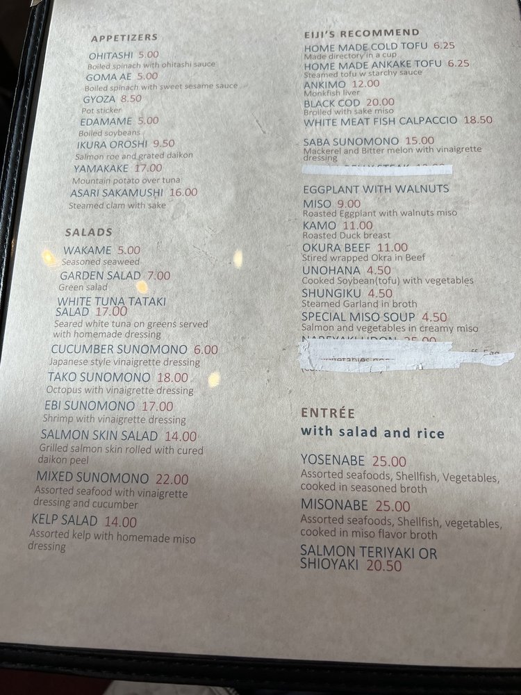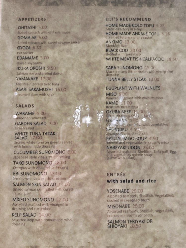 Introducing the menu at Eiji in San Francisco, a cozy Japanese sushi bar that offers a variety of options like Nigiri Sushi, Assorted Sushi, and Assorted Sashimi. Highlights include the Chirashi bowl with 9 kinds of seafood on sushi rice, the Unagi Don with BBQ eel on steamed rice, and the Deluxe Sashimi with 13 pieces of 6 different sashimi. Customers have raved about the fresh and flavorful dishes, with special mentions for the Uni, Ceviche Roll, and Salmon Skin Roll. The homemade tofu and cold sliced duck are also recommended choices. Enjoy a quiet and intimate dining experience with attentive service and a diverse menu that captures the essence of Japanese cuisine. Be sure to try out the unique dishes like the salmon skin salad and daifuku mochi for a delightful culinary experience at Eiji.